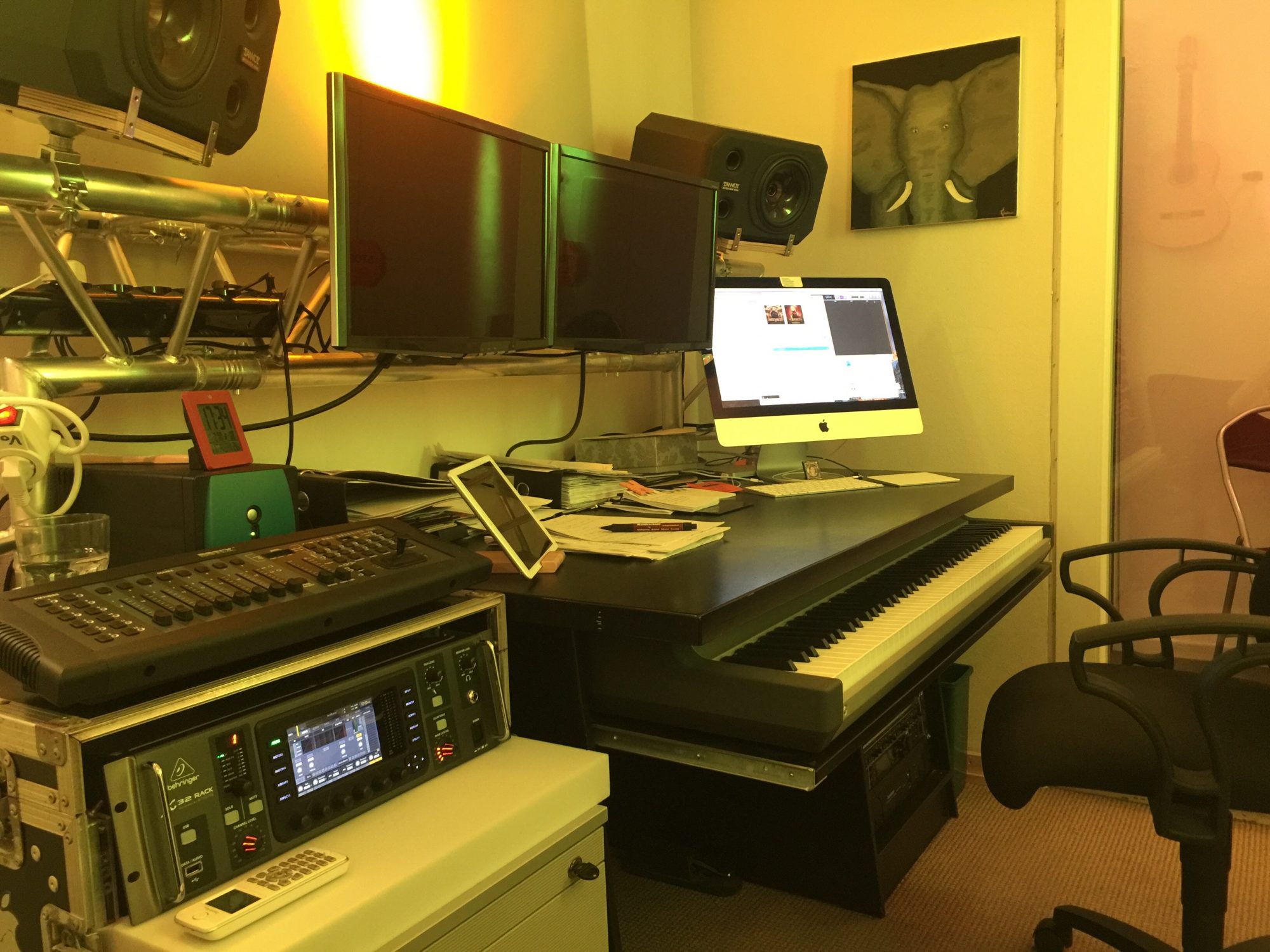Und so kann ich munter mein Schlagzeug betrommeln und alles fernsteuern, während der Computer im Regieraum alles aufnimmt.